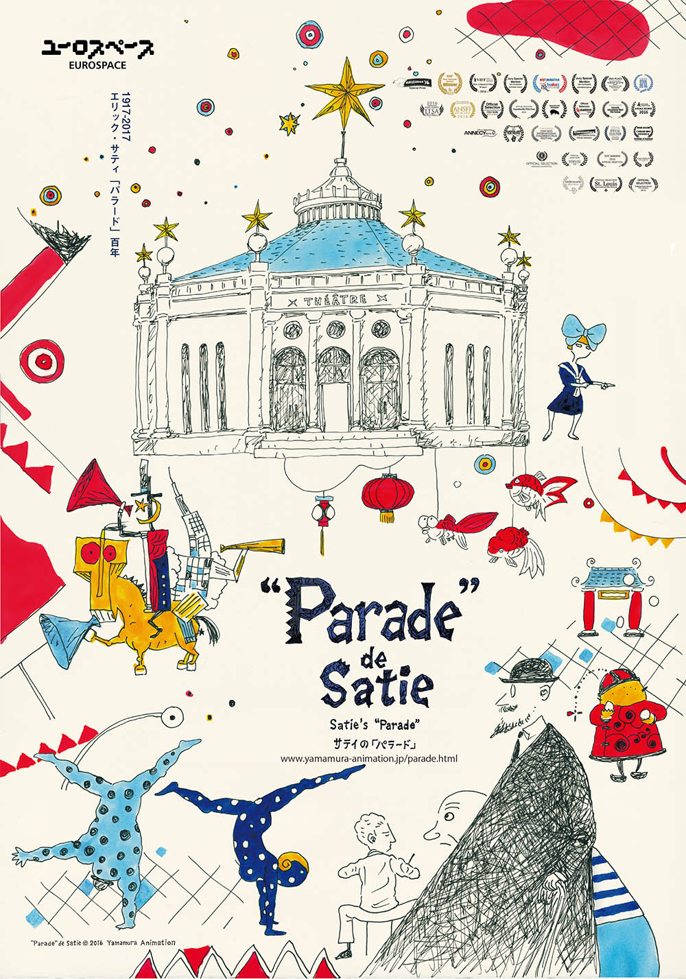 『頭山』が第75回アカデミー賞短編アニメーション部門ノミネートで注目を集め、昨年度からは映画芸術科学アカデミー会員となるなど、世界的に活躍するアニメーション作家・山村浩二の最新短編のロードショー。『サティの「パラード」』は、1917年バレエ・リュスのパリ初演百年を記念して制作。奇しくも今年2017年は日本のアニメーション誕生百年の年でもある。「山村浩二 右目と左目でみる夢」は、映画的な構造を離れ、アニメーションという枠をも超えた表現へと踏み出す山村の次のステージをみせてくれる。必見!