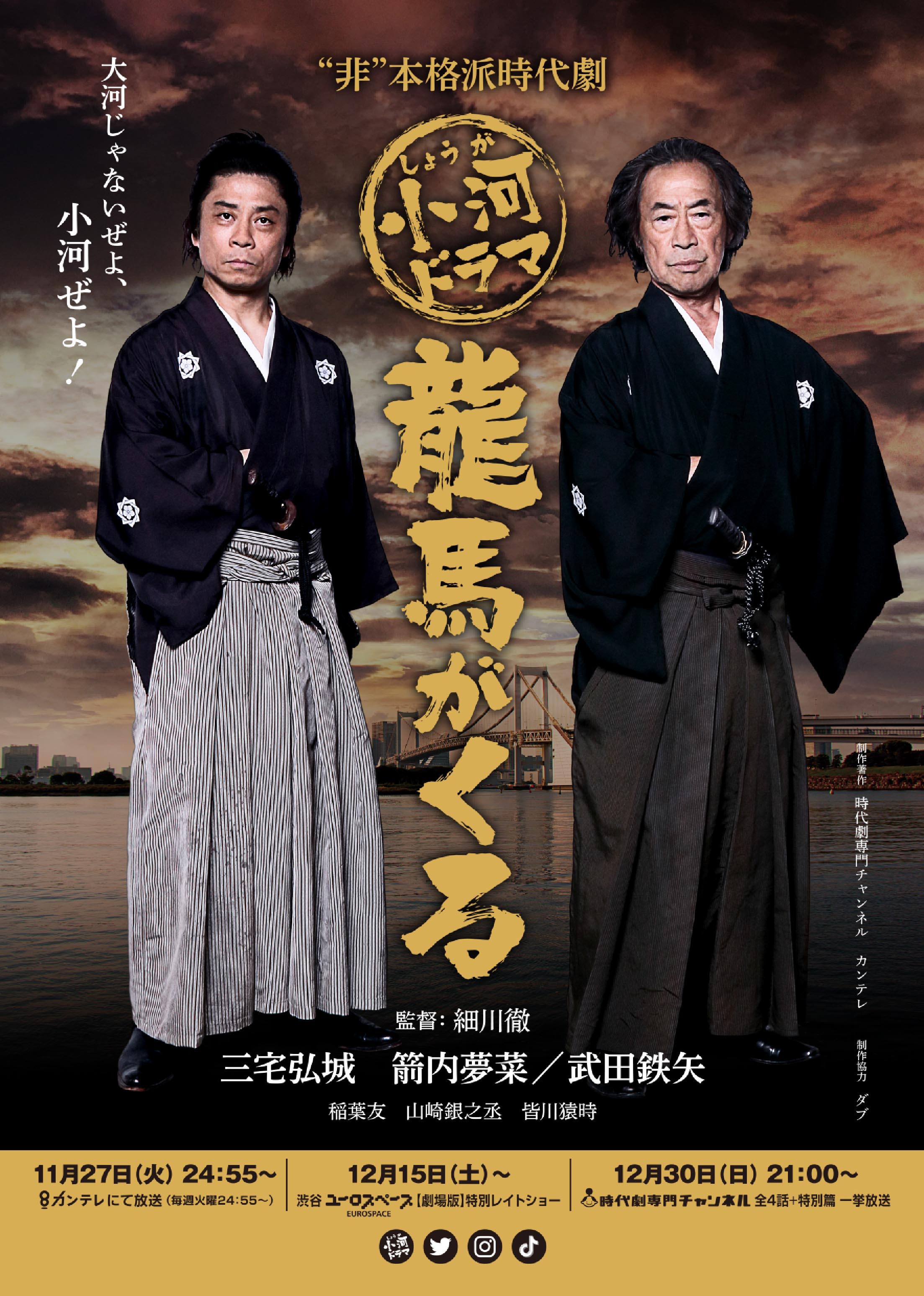 昨年“スケールの小さい、笑える史実だけで織田信長を描く”というコンセプトの元、「大河ドラマ」ならぬ「小河(しょうが)ドラマ 織田信長」を世に放った、奇才ギャグクリエイター細川徹。同作はマニアックなファンの間で熱狂的な人気を博したが、それから1年。本家・大河ドラマ「西郷どん」が盛り上がる中、細川徹率いるチーム小河が、年の瀬にこんな恐ろしい企画を用意していた!題して「小河ドラマ 龍馬がくる」だ!坂本龍馬に扮するのは、NHK連続テレビ小説「あさが来た」の番頭・亀助役でブレイクした三宅弘城。劇中劇で坂本龍馬を演じる主演俳優役は、自他ともに認める龍馬の大ファン武田鉄矢が、なんと「人生最後の龍馬」を演じる本人役として出演!そして劇中劇で武田と年が離れすぎた妻を演じるのは、ミスセブンティーン2017グランプリであり、初出演のドラマ「チア☆ダン」も好評な話題の美少女・箭内夢菜が、こちらも本人役として時代劇(?)初出演を果たす!