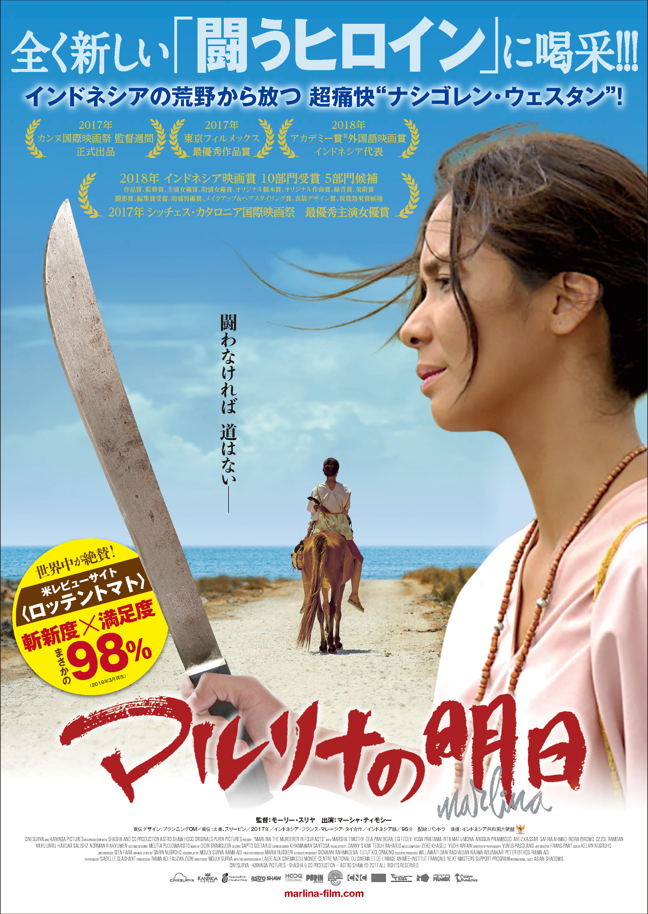 哀愁が漂うマカロニ・ウェスタンの音楽、獲物を狙うように鈍く光る剣ナタ、灼けつく太陽と果てしない荒野…。7人の強盗団から残酷に虐げられた美貌の未亡人マルリナが、自らの正義と明日をかけて、いま、颯爽と馬に跨がり、誰も見たことのない復讐の旅に出る―!インドネシアの若き女性監督が、この上ない映画愛をあふれさせながら、前代未聞の雰囲気を全編にまとわせ、全く新しい〈闘うヒロイン〉を生み出した!このインドネシアの流儀で貫かれた、ひとりの女性の闘いの物語は、さりげないユーモアも織り交ぜた会心の娯楽活劇として、カンヌをはじめ世界各国の映画祭で賞賛の嵐!まさに、異色の傑作エンタテイメントともいうべき、インドネシア流西部劇=“ナシゴレン・ウェスタン”が誕生した。